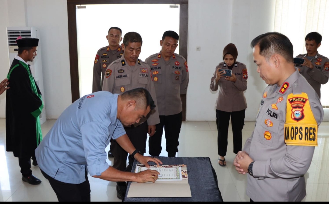 LUWU- Kapolres Luwu AKBP Arisandi S.H., S.I.K., M.Si. hadiri acara Penandatanganan Pakta Integritas dan Pengambilan Sumpah Penerimaan Terpadu Taruna/i Akpol, Bintara, dan Tamtama Polri TA. 2023 Polda Sulsel, via Zoom bertempat di Aula Tebbake Tongngenge Polres Luwu, Senin (17/4/2023).