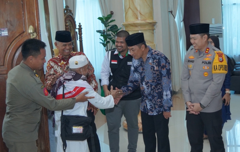 LUWU- Bupati Luwu, Dr. Drs. H. Basmin Mattayang menyambut 284 jamaah haji asal Kabupaten Luwu kloter 12 di Aula Rujab Bupati Luwu, Kelurahan Pammanu, Belopa Utara, Sabtu (15/07/2023).