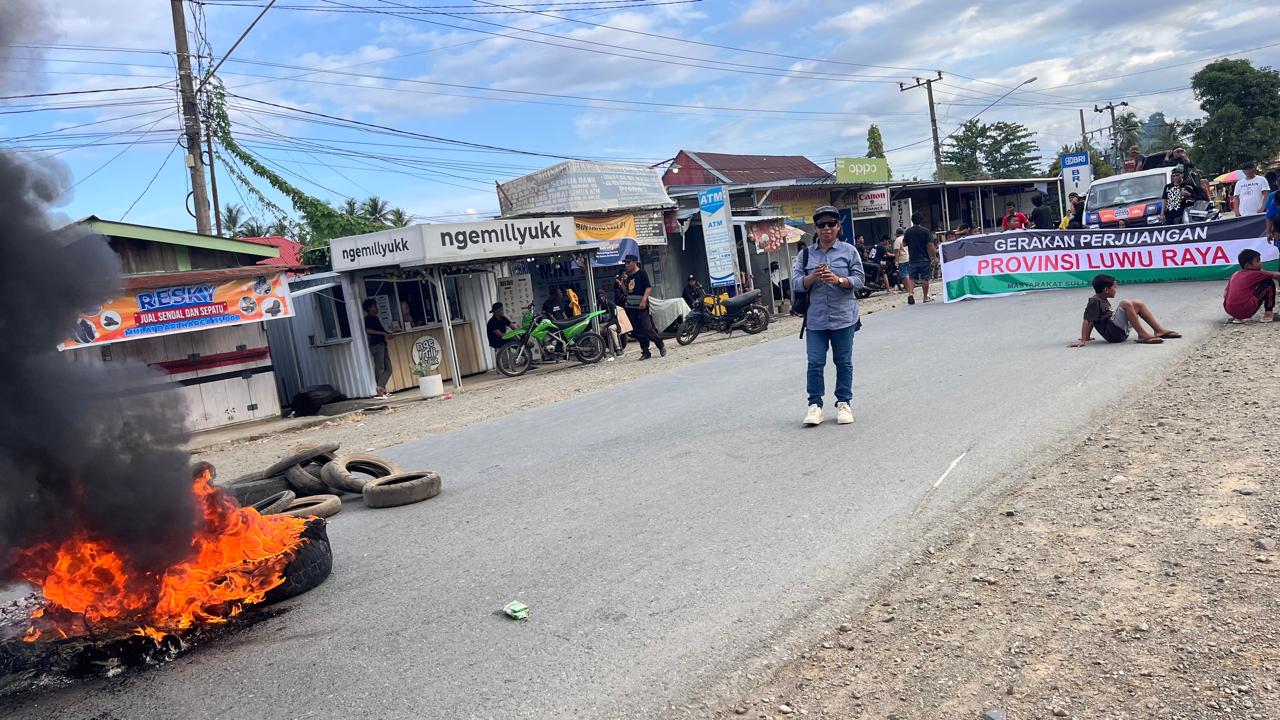 Blokade jalan menyebabkan arus logistik dan transportasi dari arah Makassar dan Palopo lumpuh selama berjam-jam.