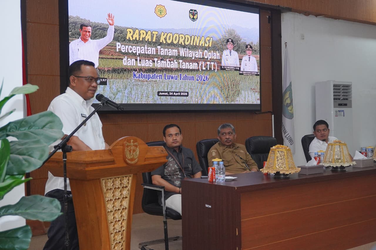 LUWU, Vedianews.con-Bupati Luwu, Patahudding, menekankan pentingnya penguatan peran penyuluh saat Rapat Koordinasi Percepatan Tanam Wilayah Optimalisasi Lahan (Oplah) dan Luas Tambah Tanam (LTT) di Aula Rumah Jabatan Bupati Luwu, Jumat (24/4/2026).