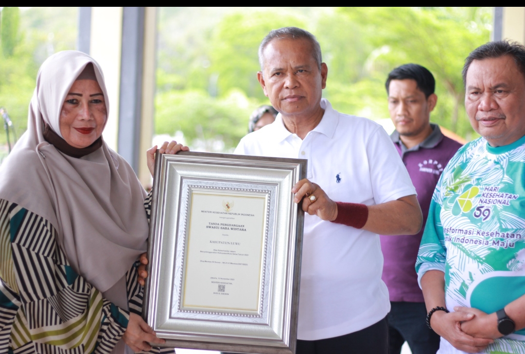 Usai memberikan sambutan, Bupati Luwu menyerahkan piagam penghargaan Swasti Saba Wistara dari Kementerian Kesehatan RI kepada Ketua Forum Kabupaten Sehat Kabupaten Luwu, Hj. Hayarna Hakim yang berhasil meraih penghargaan tersebut untuk kedua kalinya.