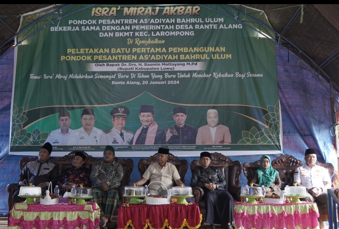 Peletakan batu pertama tersebut dirangkaikan dengan peringatan Isra’ Mi’raj Akbar Pondok Pesantren As’adiyah Bahrul Ulum bekerja sama dengan Pemerintah Desa Rante Alang dan BKMT Kecamatan Larompong.