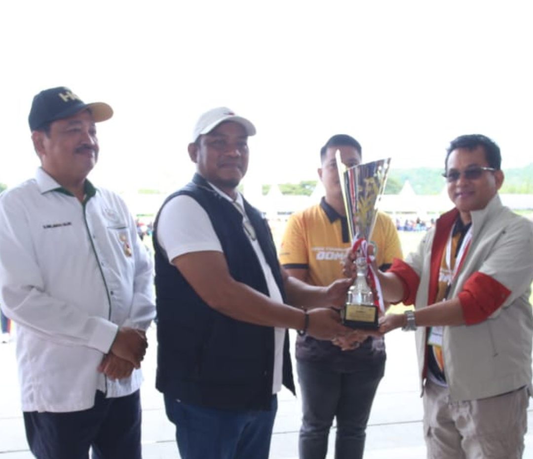 Foto :Bupati Luwu H Patahudding Menyerahkan Piala Menpora RI Kepada Ketua Panitia Turnamen Domino DR.Isrun di Tribun Lapangan Andi Jemma Belopa,Sabtu(5/7/2025)