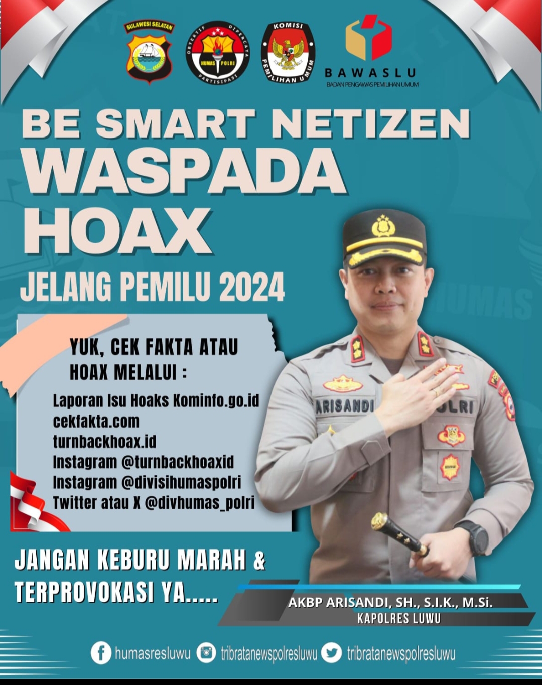 Oleh karenanya, Kapolres Luwu AKBP Arisandi menghimbau agar masyarakat pengguna media sosial di daerah Kabupaten Luwu agar lebih cerdas untuk tidak mudah marah dan terprovokasi jika mendapati kriteria berita seperti tersebut di atas.