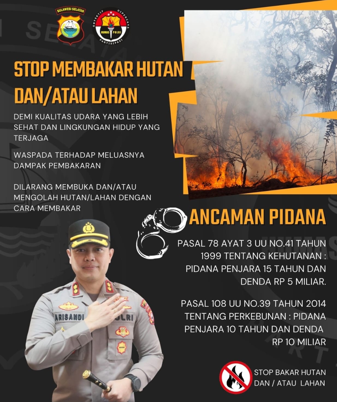 Disamping himbauan tersebut, sanksi tegas juga menanti kepada setiap orang yang masih tetap melakukan pembakaran hutan/ lahan sebagaimana diatur dalam ketentuan pasal 78 ayat 3 UU No.41 Tahun 1999 tentang Kehutanan, dengan ancaman pidana penjara 15 tahun dan denda Rp 5.000.000.000,- serta pasal 108 UU No.39 Tahun 2014 tentang Perkebunan, dengan ancaman pidana penjara 10 tahun dan denda Rp 10.000.000.000(**)