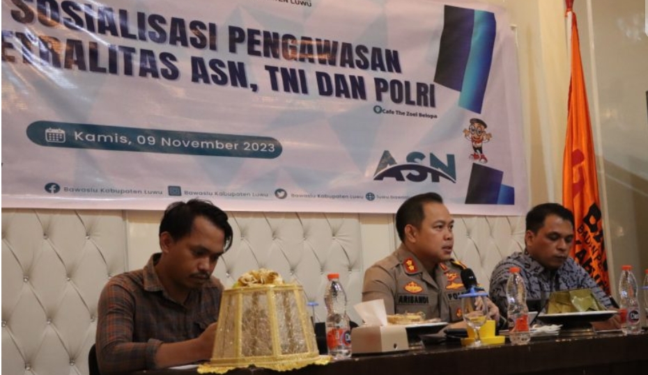 LUWU – Kapolres Luwu AKBP Arisandi, S.H., S.I.K., M.Si. hadir sebagai narasumber pada acara Sosialisasi Pengawasan Netralitas Aparatur Sipil Negara (ASN), TNI dan Polri dalam rangka pelaksanaan Pemilu dan Pilkada Serentak tahun 2024, bertempat di Aula Cafe The Zoel Belopa Kabupaten Luwu, Kamis (9/11/2023).