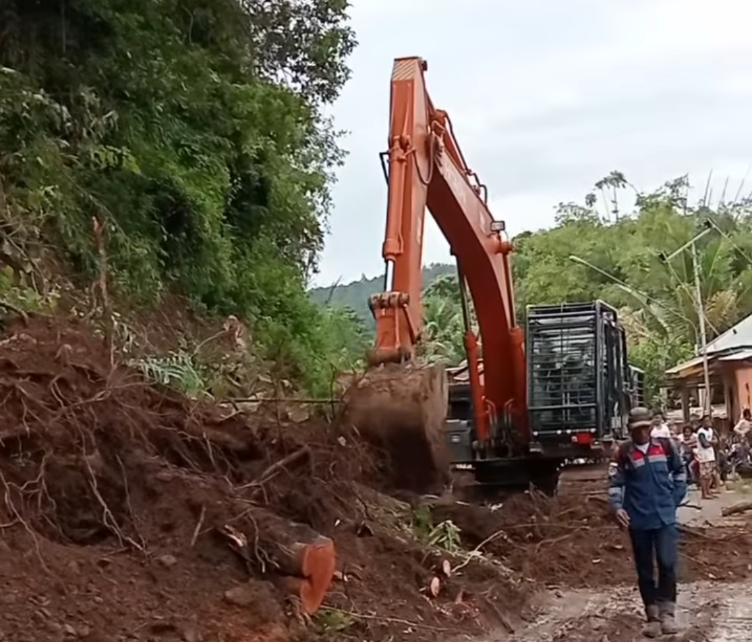 Salah satu desa yang dibersihkan akses jalan daratnya adalah desa Bonelomo yang tertutup longsoran tanah.