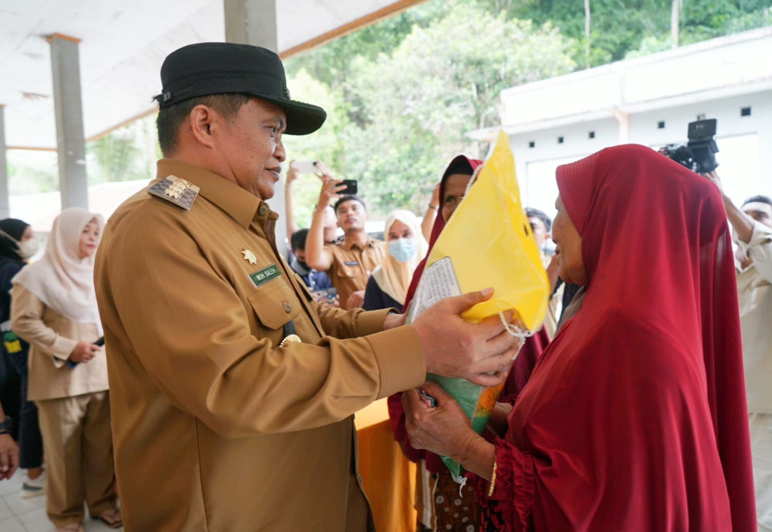 Pada kesempatan itu, Pj Bupati menyerahkan secara simbolis beras kepada perwakilan masyarakat sebagai tanda dimulainya Gerakan Pangan Murah di Kecamatan Latimojong.