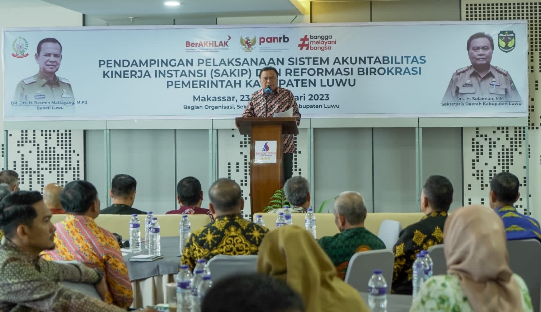 MAKASSAR– Sekretaris Daerah Kabupaten Luwu, Drs. H. Sulaiman, MM. secara resmi membuka Pendampingan Pelaksanaan Sistem Akuntabilitas Kinerja Instansi Pemerintah Dan Reformasi Birokrasi, yang dirangkaikan dengan Launching E-SAKIP Kabupaten Luwu, di Aerotel Smile, Makassar, Kamis (23/02/2023).