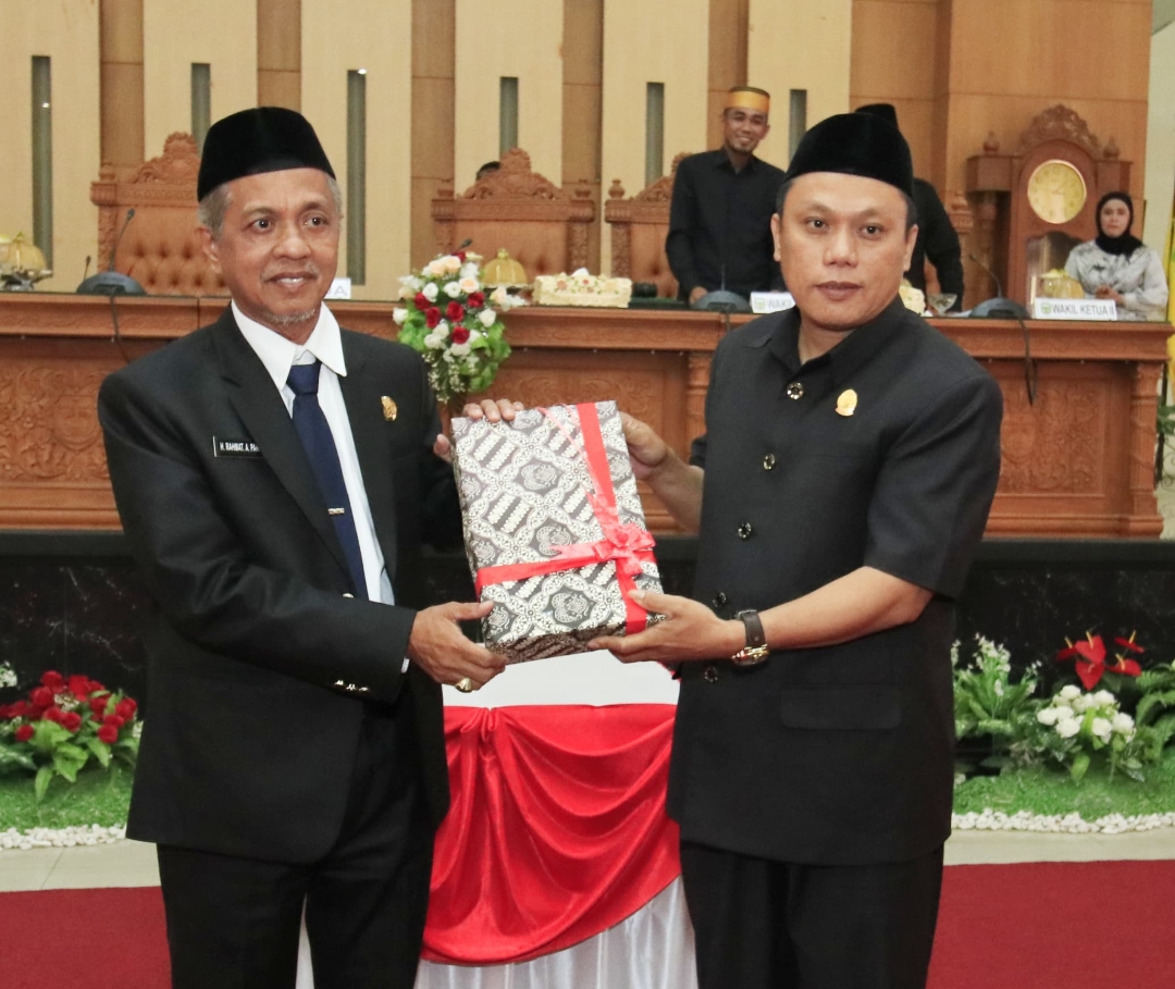 Asisten III Bidang Administrasi Umum, Drs. H. Rahmat Andi Parana menyerahkan Rancangan Peraturan Daerah (Ranperda) Perubahan Anggaran Pendapatan dan Belanja Daerah (APBD) Tahun Anggaran 2023 kepada Ketua DPRD Luwu, Rusli Sunali saat Rapat Paripurna Digelar Jum’at (15/9/2023)