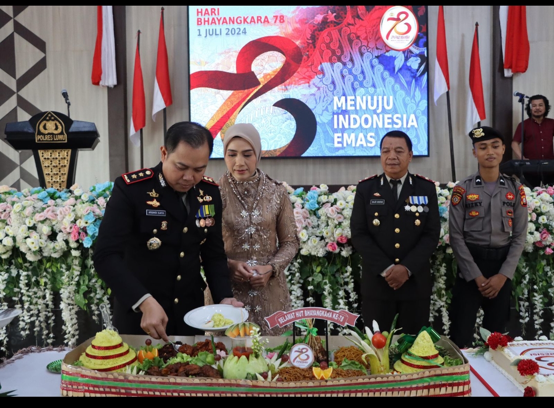 LUWU- Upacara dan syukuran peringatan HUT Bhayangkara ke-78 digelar Polres Luwu bertempat di halaman Polres Luwu dan aula Tobake Tongenge, Senin (1/7/2024).