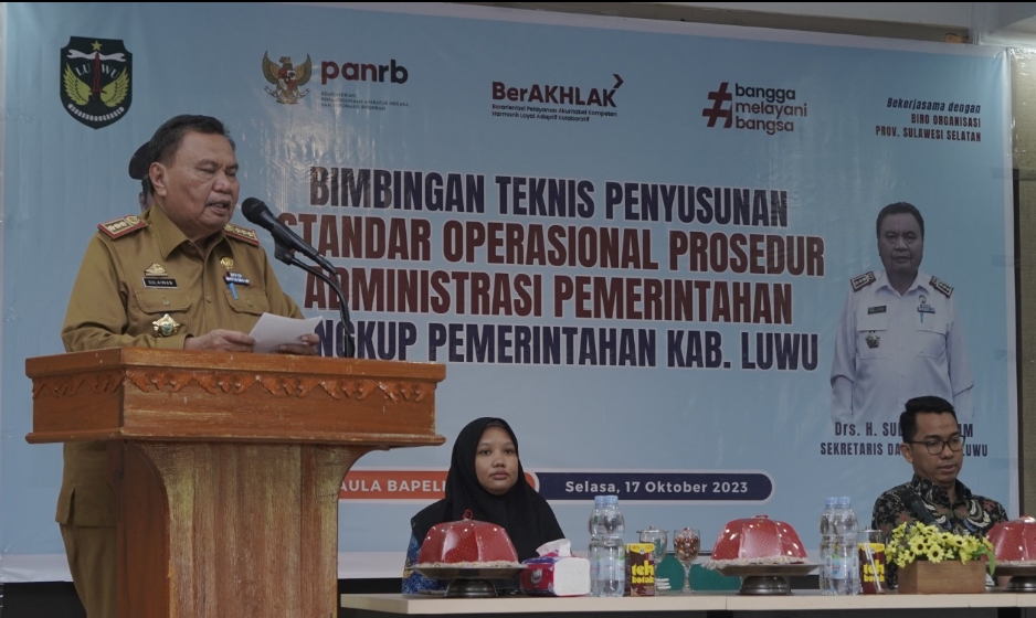 LUWU – Sekretaris Daerah Kabupaten Luwu, Drs. Sulaiman, MM membuka secara resmi kegiatan Bimbingan Teknis Penyusunan Standar Operasional Prosedur (SOP) Administrasi Pemerintahan yang diselenggarakan oleh Bagian Organisasi Setda Luwu di aula Kantor Bappelitbangda, Selasa (17/10/2023).