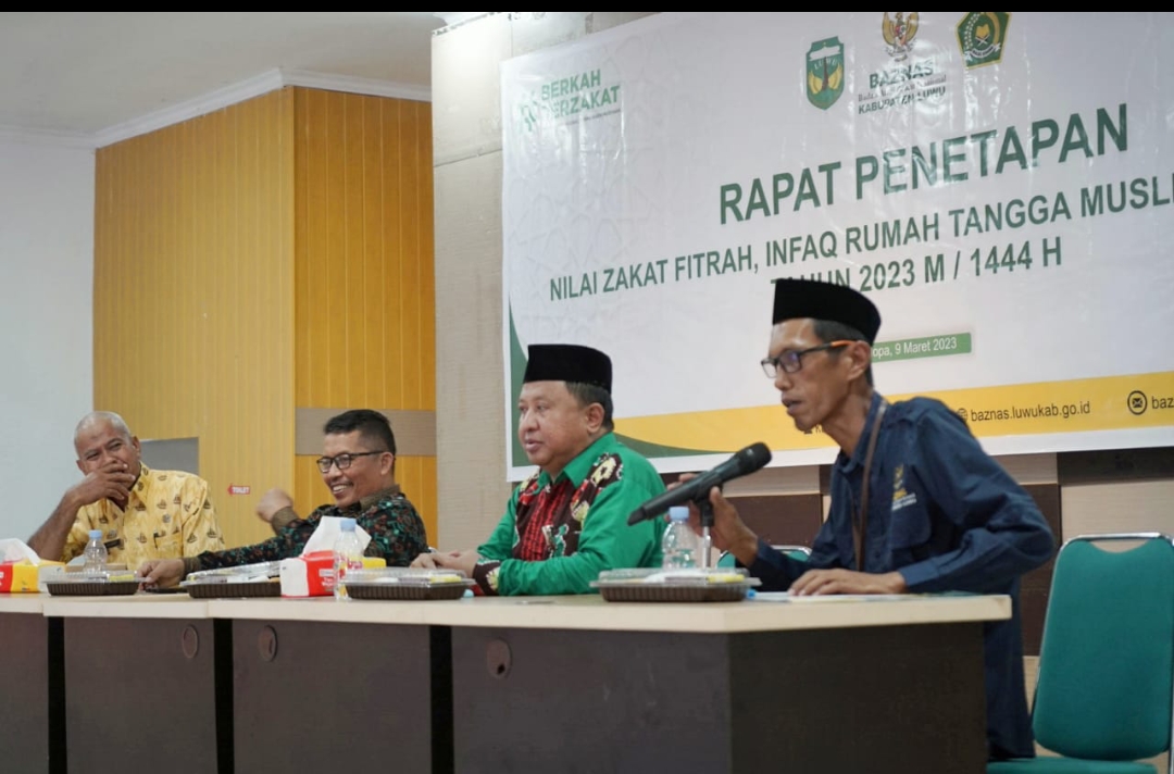 LUWU- Badan Amil Zakat Nasional (BAZNAS) Kabupaten Luwu mengelar Rapat Penetapan nilai pembayaran Zakat Fitrah, Infaq Rumah Tangga Muslim (IRTM) dan Fidyah 1444 H tahun 2023 yang dilaksanakan di aula Kantor Bappelitbangda, Kelurahan Senga Kecamatan Belopa, Kamis (9/3/2023)
