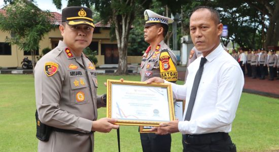 Kapolres Luwu, AKBP Arisandi, memberikan piagam penghargaan kepada Satuan Lalu Lintas (Satlantas) dan Satuan Intelijen dan Keamanan (Satintelkam) Polres Luwu dalam apel