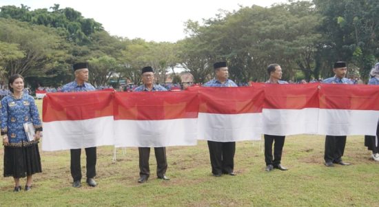 Bupati Luwu, Dr. Drs. H. Basmin Mattayang, MPd secara simbolik menyerahkan Bendera Merah Putih kepada sejumlah camat pada kegiatan upacara Hari Kesadaran