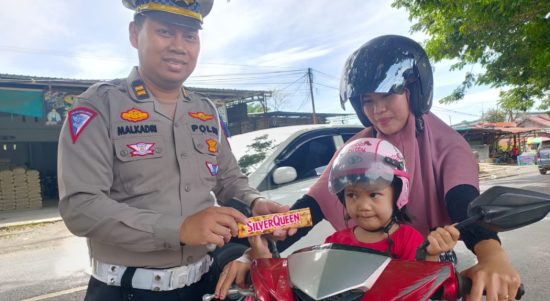 Kanit Regident Polres Luwu Iptu Malkadri Ibrahim saat membagikan Coklat kepada Pengendara roda dua di kabupaten Luwu LUWU – Hari ke Delapan