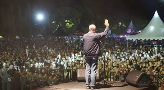 Bupati Luwu, Basmin Mattayang menyapa ribuan masyarakat saat konser Tri Suaka-Nabila memukau ribuan warga Luwu dalam rangka HUT ke-17 Belopa sebagai ibukota