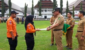 tiba depan panggung kehormatan ,para peserta gerak jalan memberi hormat di hadapan Wabup Luwu Syukur Bijak bersama istrinya Elnita Pakolo dan tetamu lainnya.